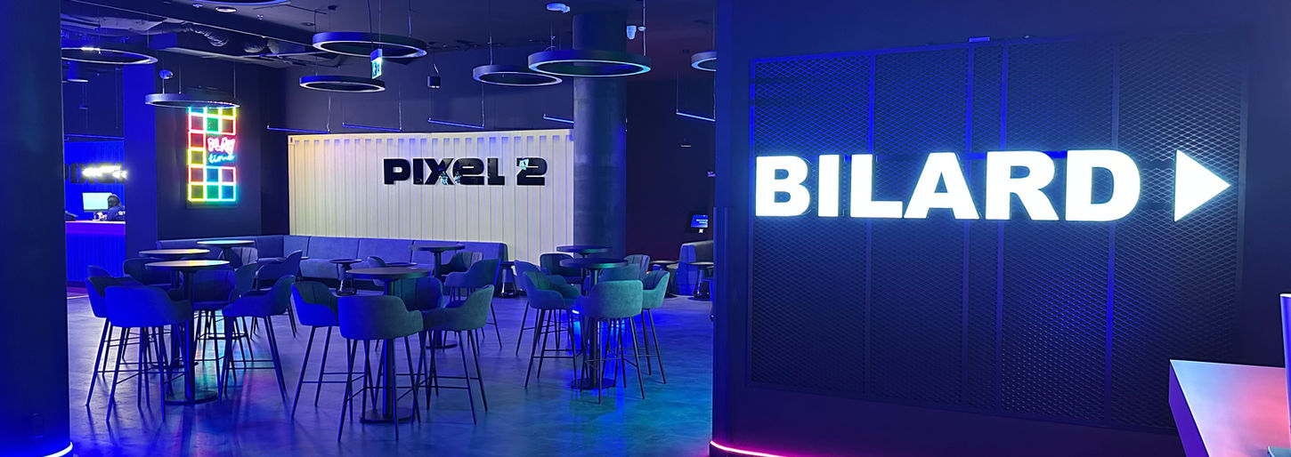 Bilard, Pixel, Mini Golf, Dart, Shuffleboard, Bar i Strefa Eventowa - każda z tych sekcji zasługiwała na własną ekspozycję, ale jednocześnie musiała być częścią spójnej wizualnej narracji całego miejsca.